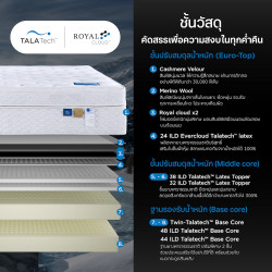 Meticulous Euro-Top design lets you dream weightlessly. Founded on Double-Talatech Base and Middle Core system, the mattress offers solid weight support and absolute balance where you need it most and the absorbing Topper Core system sensually responds to curve of your body offering a bottomless sensation reminiscent of sleeping on a cloud. Luxuriously soft Cashmere-velour cover below your precious skin envelops extremely fine humidity-absorbable Italian Merino Wool which breathes to optimize the surrounding micro-climate and the signature Evercloud latex padding further eliminates last remaining body pressure points.