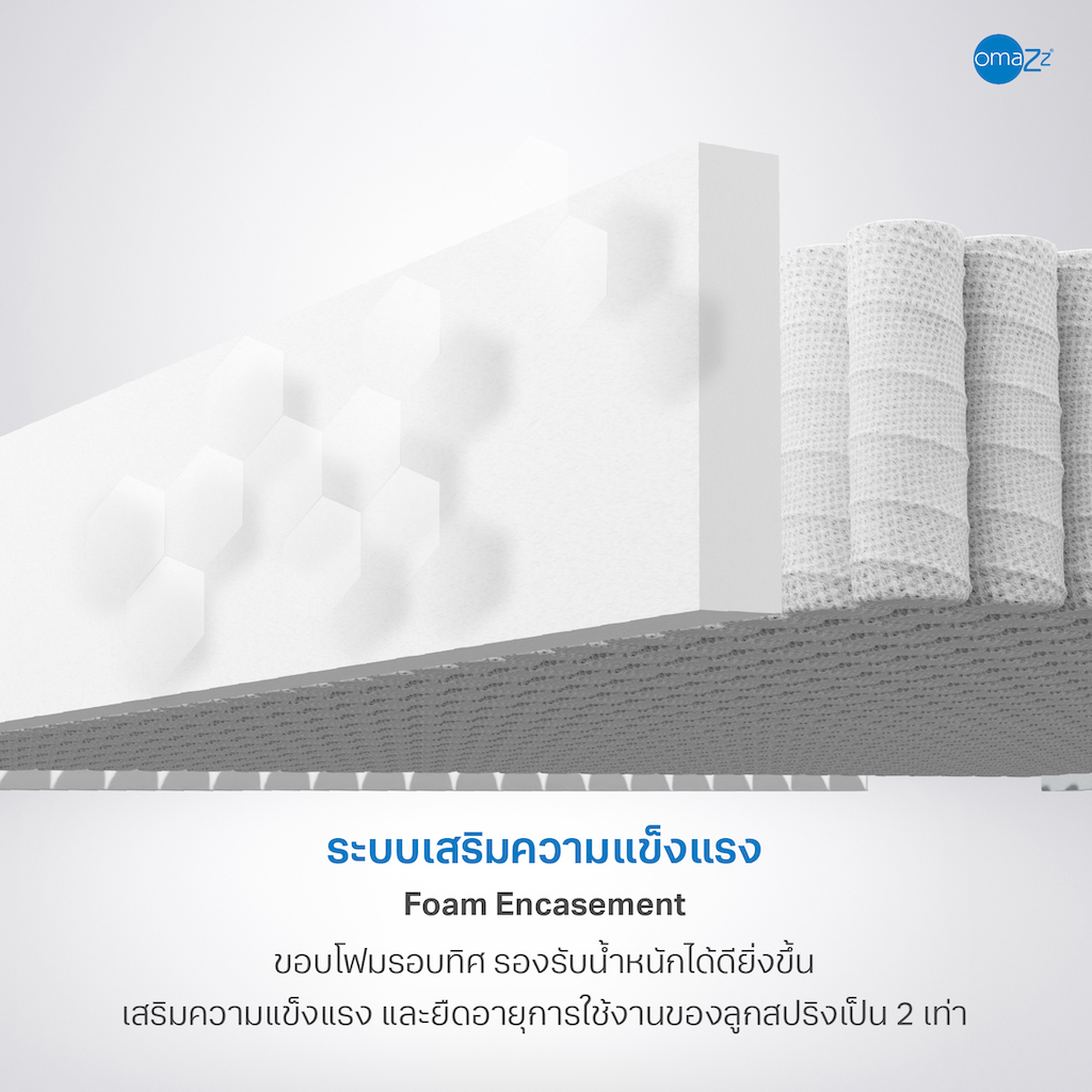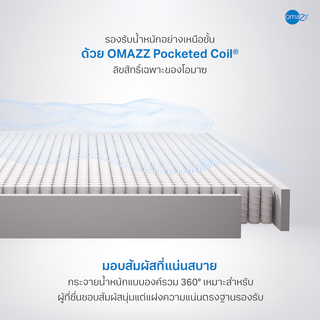 • Omazz Pocketed Coil สร้างอิสรภาพในการทำงานของลูกสปริงอย่างอิสระ เหมาะสำหรับผู้ที่ชื่นชอบสัมผัสแรกที่นุ่มลุ่มลึกบนความแน่นกำลังดี