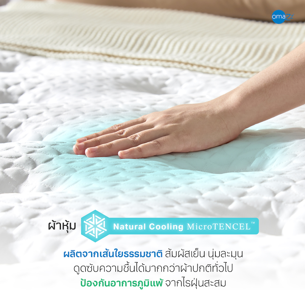 • Natural Cooling MicroTENCEL™: เส้นใยจากธรรมชาติ ผ่านกระบวนการผลิตที่เป็นมิตรกับสิ่งแวดล้อม เสริมนวัตกรรม Cooling ให้สัมผัสเย็นอย่างต่อเนื่อง นุ่มละมุน อ่อนโยนต่อผิวพรรณ ทั้งยังสามารถระบายอากาศได้ดี ดูดซับความชื้นได้มากกว่าผ้าปกติทั่วไป ให้ความรู้สึกแห้งสบายตลอดการพักผ่อน และทนทาน ใช้งานได้ยาวนาน