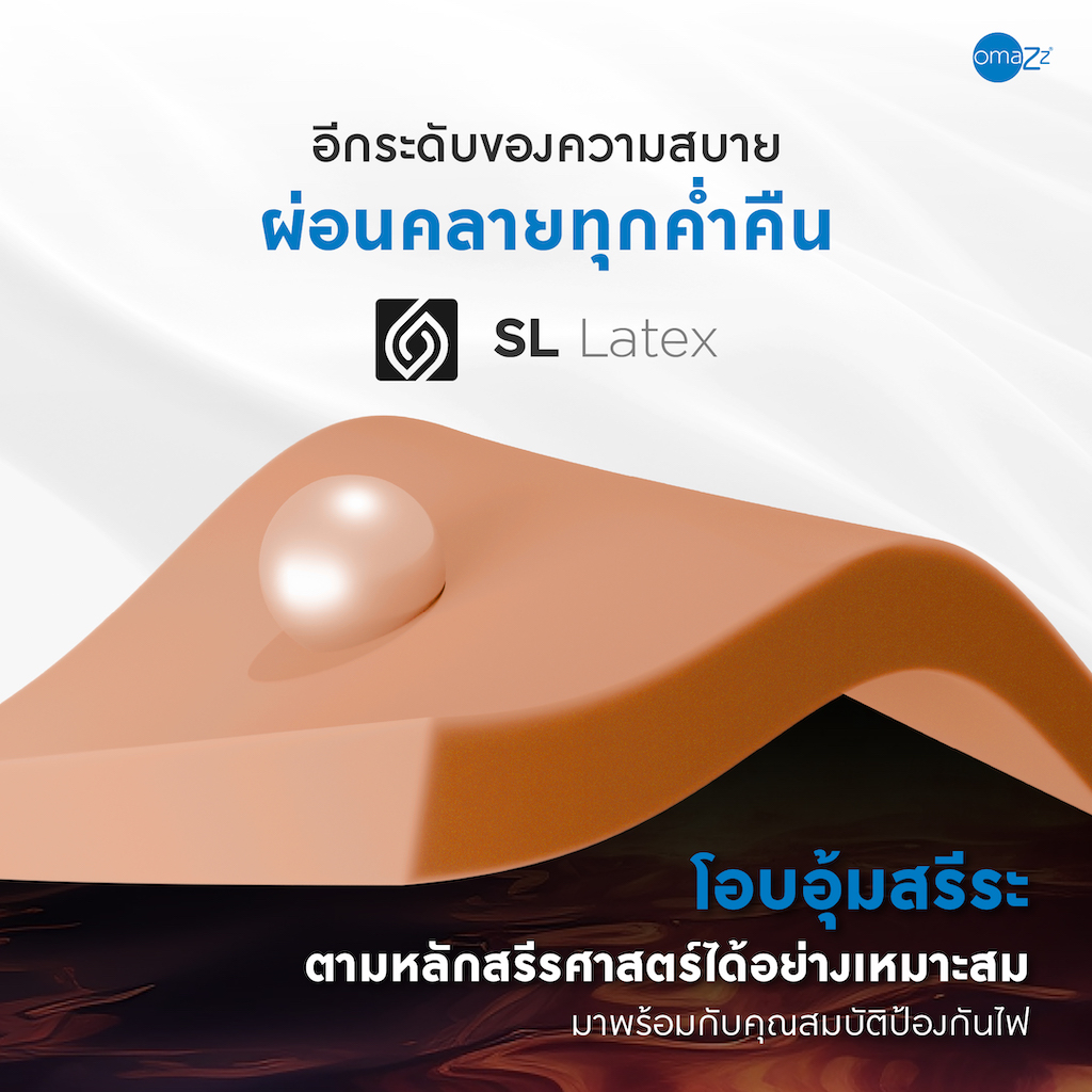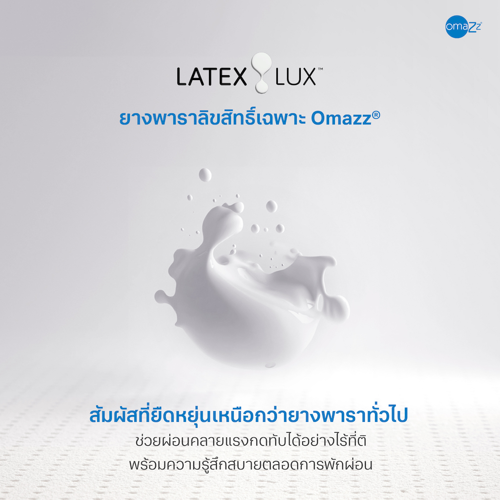 • LatexLux ยางพาราลิขสิทธิ์เฉพาะ Omazz สัมผัสยืดหยุ่นเหนือกว่ายางพาราทั่วไป ช่วยผ่อนคลายแรงกดทับได้อย่างไร้ที่ติ พร้อมความรู้สึกสบายตลอดการพักผ่อน ถ่ายเทอากาศและระบายความร้อนได้อย่างดีเยี่ยม