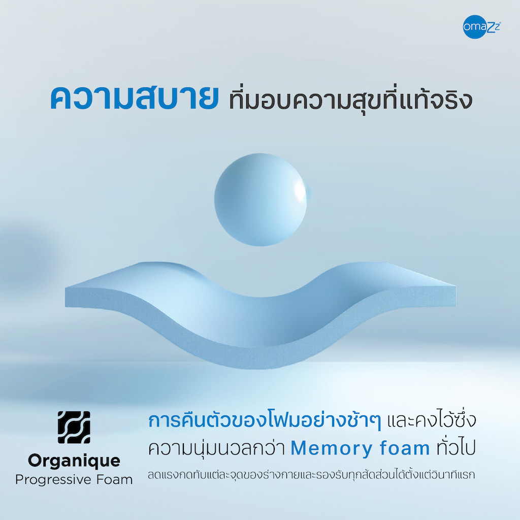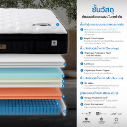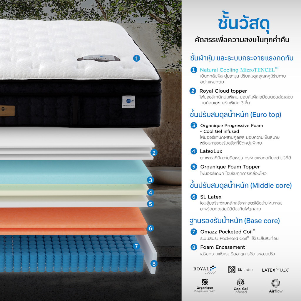 • Royal Cloud Topper ชั้นโฟมออร์แกนิกที่นุ่มเหนือชั้น ลิขสิทธิ์เฉพาะ Omazz คิดค้นเพื่อมอบสัมผัสนุ่มเป็นพิเศษเสมือนการนอนล่องลอยบนก้อนเมฆ