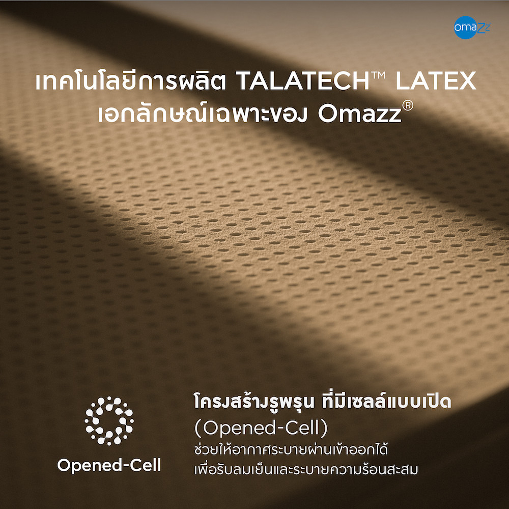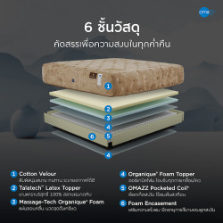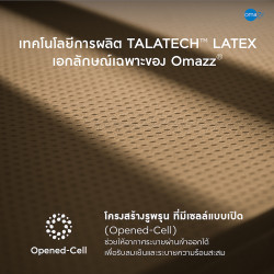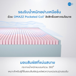 ได้รับการออกแบบมาเพื่อเติมเต็มความสุขและความรู้สึกที่สมบูรณ์แห่งการพักผ่อนในทุกยามราตรี โอบกอดสรีระอย่างนุ่มละมุนในทุกท่วงท่าการเคลื่อนไหวด้วยระบบสลายแรงกดทับที่มากถึง 3 ชั้น ซึ่งทำหน้าที่รองรับร่างกายได้อย่างสมบูรณ์ ประกอบด้วย Omazz® Talatech™ Latex ค่า ILD 36 ในชั้นแรก และ Omazz® Organique® foam ลิขสิทธิ์เฉพาะของที่นอน Omazz®  ซึ่งผิวสัมผัสถูกออกแบบให้มีพื้นผิวแบบ Egg Crate (คล้ายกล่องลังบรรจุไข่ไก่) ช่วยเพิ่มประสิทธิภาพในการนวดบริเวณแผ่นหลังอย่างเป็นธรรมชาติและนุ่มนวล รวมถึงระบบฐานรองรับน้ำหนัก (Base Core) ที่สมดุลมั่นคงด้วยโครงสร้าง Omazz® Pocketed Coil® มอบสัมผัสที่แน่นสบายลูกสปริงทำงานอย่างอิสระและช่วยกระจายน้ำหนักแบบองค์รวม 360° เหมาะสำหรับผู้ที่ชื่นชอบสัมผัสนุ่มกำลังดีในความแน่นที่พอเหมาะลงตัว