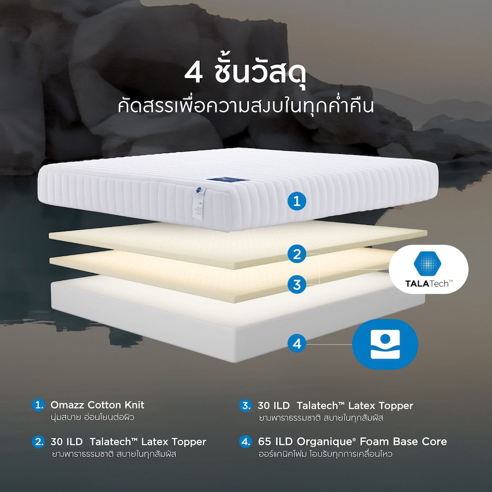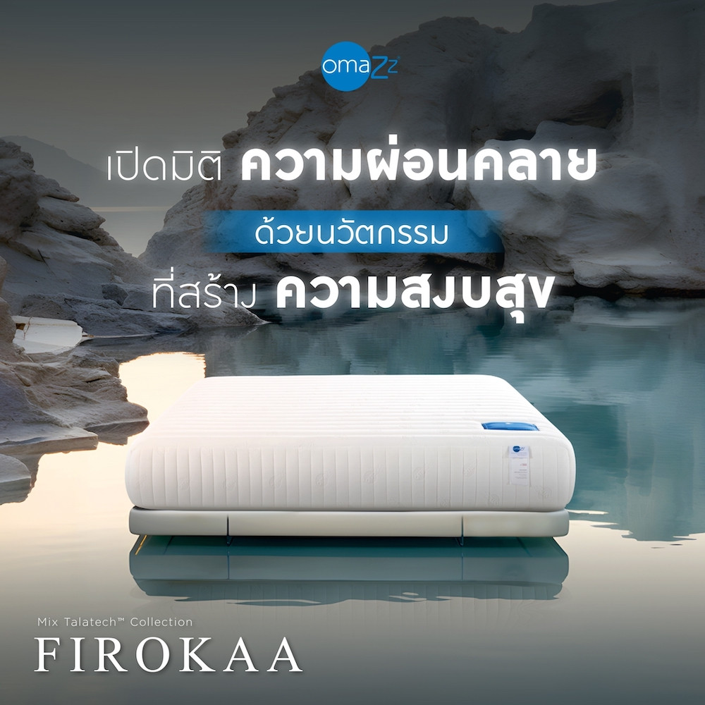 การออกแบบอย่างชาญฉลาดด้วยรูปทรงที่โดดเด่นช่วยส่งเสริมให้ที่นอนรุ่น Firokaa ที่หนานุ่มถึง 3 ชั้นเป็นนวัตกรรมการนอนที่ดีเลิศ ด้วยโฟมลาเท็กซ์ชั้นบนที่มีความยืดหยุ่นถึง 30 ILD Talatech™ Latex ที่ประกบกันถึง 2 ชั้นก่อนจะติดตั้งซ้อนไว้ข้างบนฐานโฟมออร์แกนิกที่มีความยืดหยุ่นถึง 65 ILD เพื่อนำส่งท่านก้าวเข้าสู่อีกหนึ่งระดับความสบายให้ท่านได้ผ่อนคลายในค่ำคืนที่สุดพิเศษและการนอนที่มิอาจจะอธิบายออกมาเป็นคำพูดได้ว่าความสุขที่แท้จริงนั้นเป็นอย่างไร อีกทั้ง เพื่อปรับลดแรงกดทับในแต่ละจุดของร่างกายท่านและรองรับทุกๆ สัดส่วนของร่างกายของท่านได้ตั้งแต่วินาทีแรกที่ท่านเอนกายลงบนที่นอนหลังนี้ จึงอาจกล่าวได้ว่าที่นอนรุ่น Firokaa คือ สุดยอดของนวัตกรรมการนอนเพื่อความสบายตลอดค่ำคืนของท่านอย่างแท้จริง