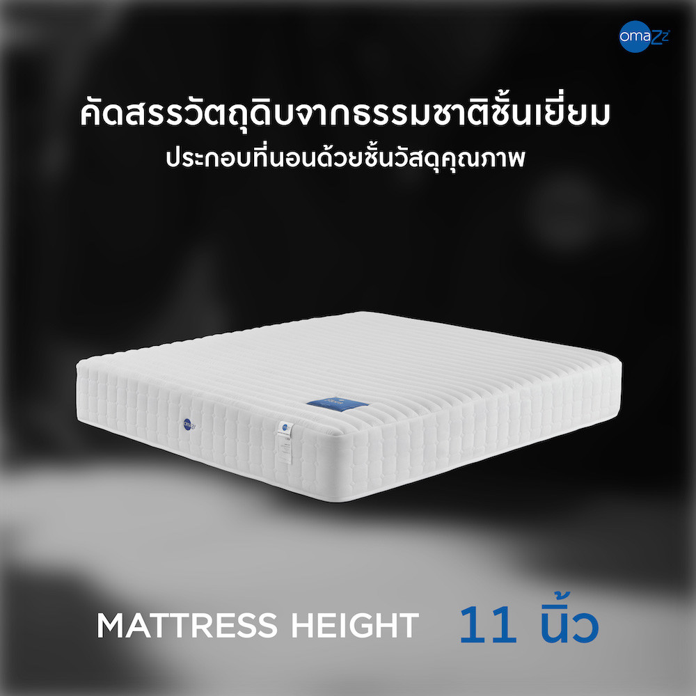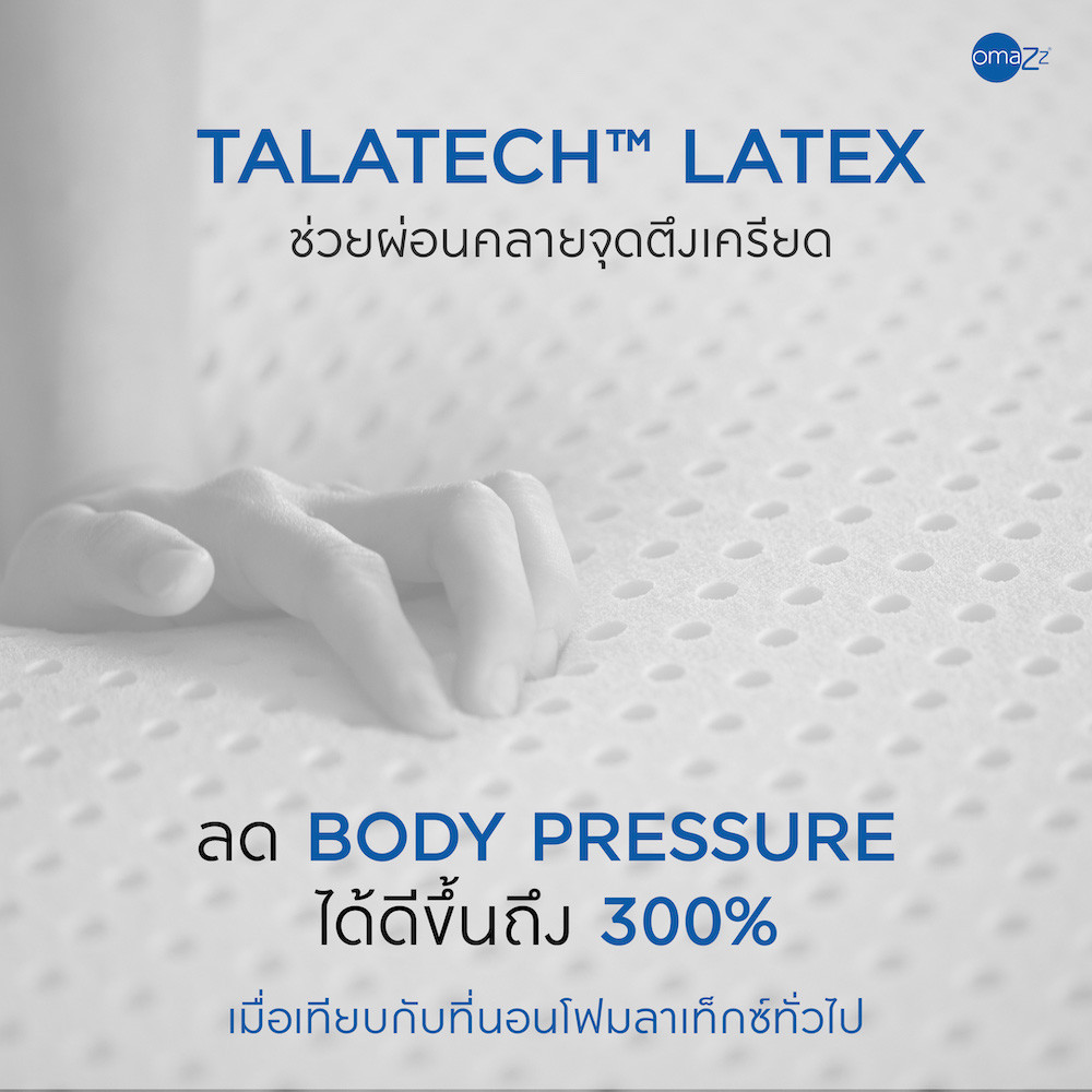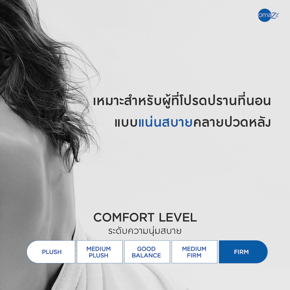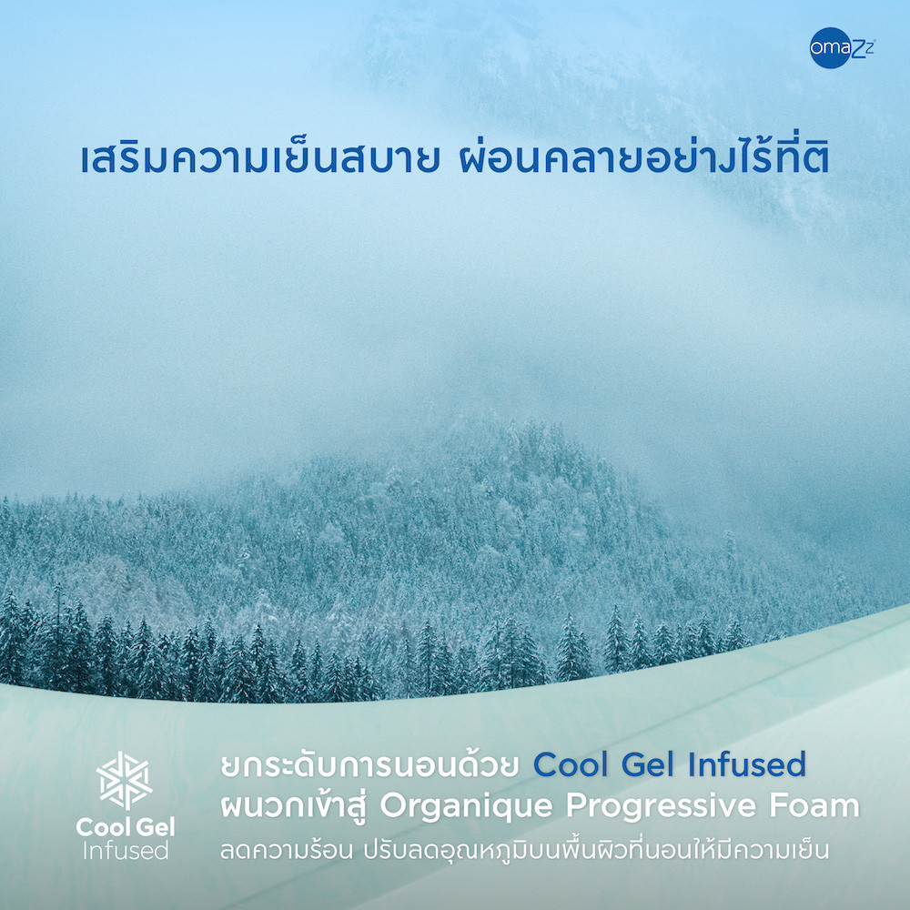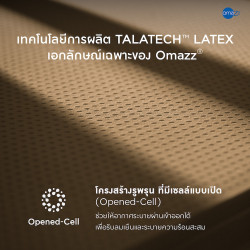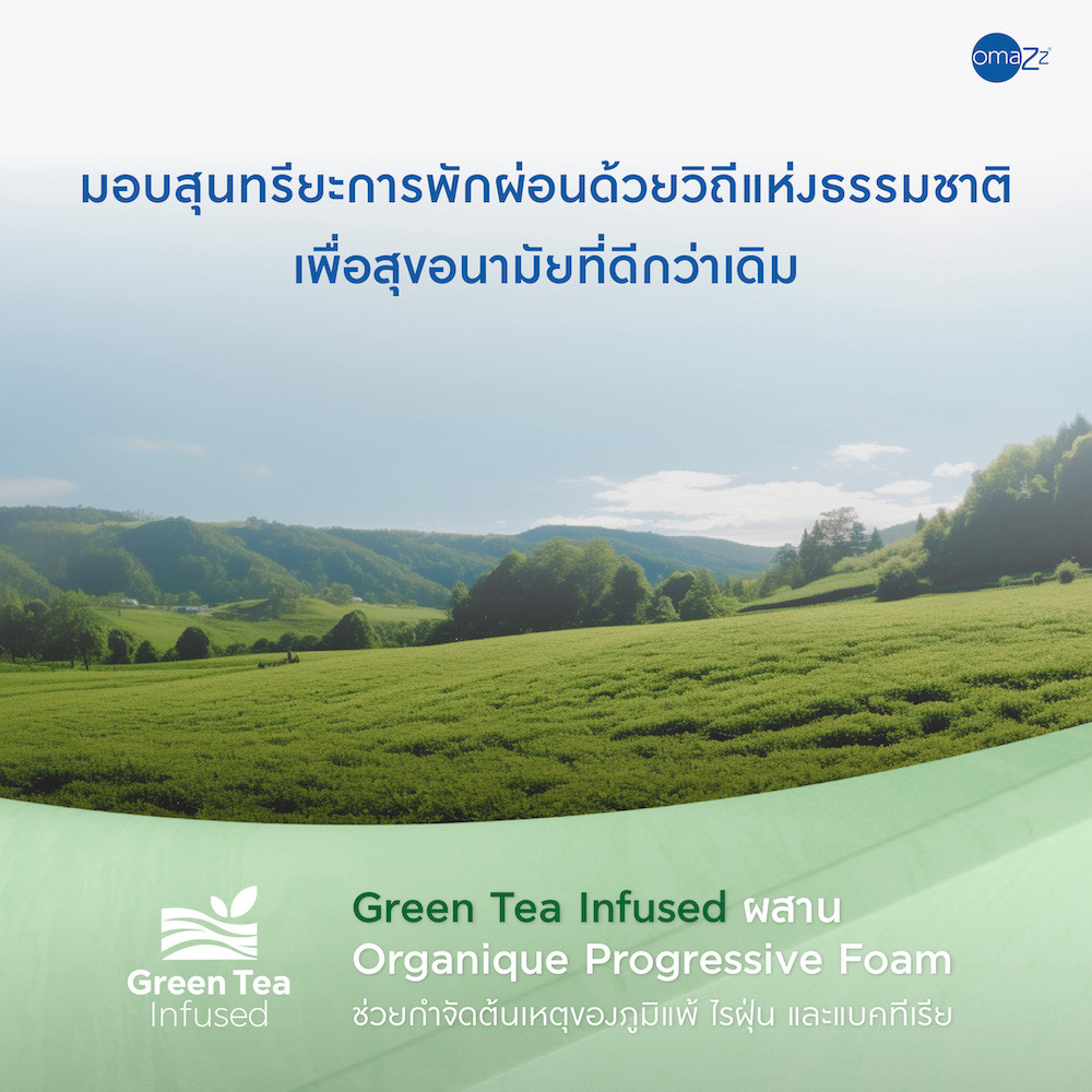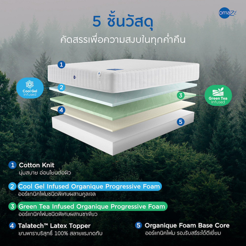 ความสงบของการพักผ่อน ที่ Omazz® ส่งมอบเพื่อเข้าถึงความรู้สึกในความสมดุลแห่งธรรมชาติ กับที่นอนรุ่น Flora ที่โอบอุ้มทุกสัดส่วนสรีระ ด้วยสารอันบริสุทธิ์ที่สกัดจากยอดอ่อนใบชาเขียวชั้นเลิศ ผนวกด้วยอนุภาคความเย็น ที่ให้สัมผัสดุจแหล่งกำเนิดต้นน้ำบนยอดเขา นวัตกรรมอีกขั้นที่เหนือระดับ ต้อนรับคุณเข้าสู่ความสุขที่แท้จริงของการพักผ่อน Omazz® ได้ผสานองค์ความรู้จากธรรมชาติเข้ากับนวัตกรรมสมัยใหม่เพื่อสร้างเทคโนโลยี Cool Gel Infused ผนวกเข้าสู่ Organique Progressive Foam ที่ผลิตจากน้ำมันสกัดจากธรรมชาติให้ความนุ่มนวลเหนือ Memory Foam อื่นๆ และ Green Tea Infusedอนุภาคสารสกัดจากยอดอ่อนใบชาเขียวใน Organique Foam โฟมนุ่มแน่นที่ปราศจากสารเคมี ลงในที่นอนรุ่น Flora เพื่อมอบความรู้สึกสบายอันโดดเด่นเป็นเอกลักษณ์ โดยอนุภาคชั้น Organique Progressive Foam - Cool Gel Infuesd ช่วยขจัดความร้อน ปรับลดอุณหภูมิบนพื้นผิวที่นอนให้มีความเย็น รองรับแต่ละจุดของร่างกายได้อย่างสมบูรณ์ ส่วนในชั้น Organique Foam - Green Tea Infused นอกเหนือจากคุณสมบัติของโฟมที่ยกระดับ การกระจายน้ำหนักให้เหมาะสม สารสกัดจากชาเขียวยังเพิ่มประสิทธิภาพในการลดอนุมูลอิสระ บริเวณพื้นผิวที่นอนซึ่งเป็นต้นเหตุของกลิ่นอับชื้น อีกทั้งลดแบคทีเรียและไรฝุ่นภายในที่นอนได้เป็นอย่างดี รวมถึงเอกลักษณ์เฉพาะของ Omazz® กับ Talatech™ Latex 36 ILD แบบบาง 1.5 ซม. ที่ผ่านกรรมวิธีผลิตแบบ Talatech™ ที่นำน้ำยางพาราแช่แข็งในอุณหภูมิ -20 องศาฟาเรนไฮต์ จากนั้นจึงเติมมวลอากาศเข้าไปและอบที่ความร้อนสูงถึง 220 องศาฟาเรนไฮต์ เพื่อให้ได้โฟมยางพารา แบบ Talatech™ ที่ทําให้รู้สึกสบายในขณะที่ช่วยผ่อนคลายจุดที่ตึงเครียด (Body Pressure) ได้ดีขึ้นถึง 200% เสริมความแน่นแต่โอบรับนุ่มนวลด้วยระบบรองรับน้ำหนัก 70 ILD Organique Foam Base Core รองรับน้ำหนักได้เต็มประสิทธิภาพดูดซับแรงสั่นสะเทือนเพื่อตอบสนองการพักผ่อนอันบริสุทธิ์ในค่ำคืนที่สงบ |