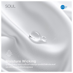 - Moisture wicking: ดูดซับและระบายความชื้นได้ดี ลดโอกาสการเกิดกลิ่นไม่พึงประสงค์ และปรับสมดุลผิวกายให้แห้งสบายอยู่เสมอ